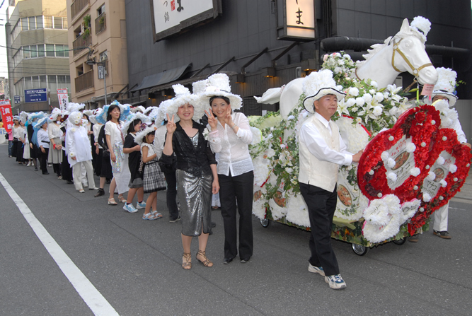 花で飾られた白馬と共に、子供たちも含めて約100名という大きなパレード隊になりました。 無事、終えたときの充実感はなんとも言えない感激がありました。